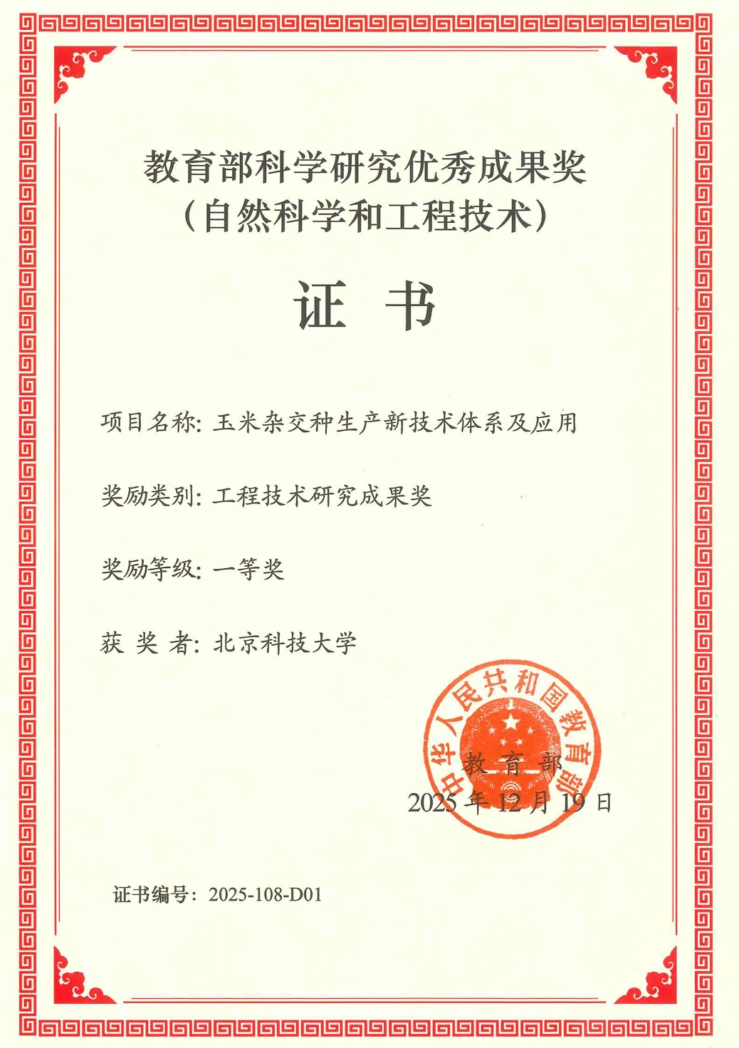 该项目在理论研究、技术发明等方面创新成效显著,获国家发明专利53项,制定国家和行业标准3项,获北京市新技术证书3项,获国家植物新品种权28个,培育玉米新品种6个,出版专著5部,发表系列高水平论文;玉米新品种、不育化制种、无隔离制种和高活力种子生产技术等推广应用累计超1049万亩,经济效益超106亿元。该成果获得2025年教育部科学研究优秀成果奖(工程技术奖)一等奖