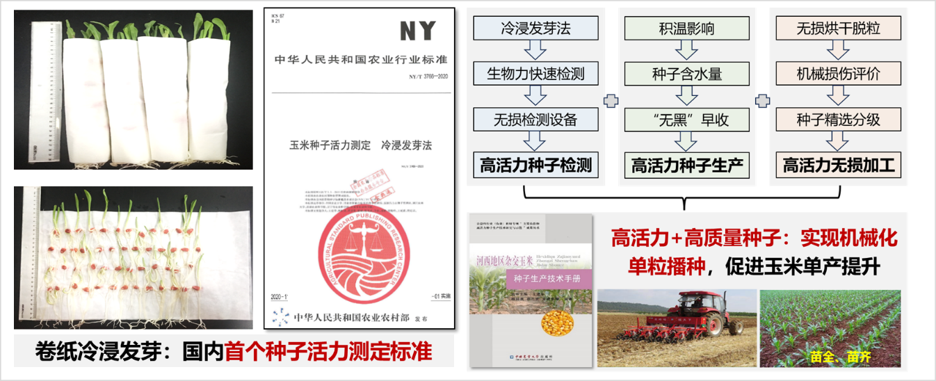 创新玉米种子活力检测和生产理论,首创高活力种子生产技术,填补了玉米种子活力检测和高活力种子生产的国内空白,并开发配套检测和生产设备。针对我国玉米品种的种子活力普遍较低、不利于单粒机播等问题,项目率先发明玉米高活力种子生产技术并推广应用。发明“冷浸发芽法” “生物力适时检测”“无损检测”等3种种子活力检测新方法,制定了我国首个玉米种子活力测定行业标准;建立“适时早收”的高活力种子生产技术并制定行业标准;集成发明玉米高活力种子生产和无损加工技术体系(图5),使种子活力提高10%以上,在甘肃、新疆国家玉米杂交制种基地累计应用推广超424.4万亩,产生了显著的社会经济效益。