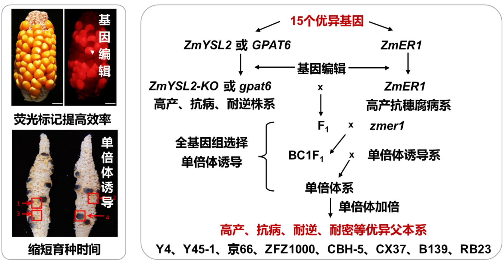 针对缺乏优异父本系、育种技术相对落后,挖掘玉米高产抗病耐逆等优异基因,发明玉米整合分子设计育种技术体系,精准创制优异父本系,提高玉米育种效率和产量。项目组挖掘了玉米产量、抗病、耐逆、叶夹角等相关基因,并揭示其影响玉米重要性状形成的分子机理。创建整合分子设计育种技术,快速精准创制综合性状优异的父本自交系(图4):基于单倍体诱导系,结合构建的双荧光单倍体筛选DFP报告系统和靶向CRISPR-Cas9基因编辑系统,创制了3个单倍体诱导联合基因编辑系,单倍体诱导率为8.55%-20.89%;受体单倍体的靶基因编辑效率达0.38%1.46%,实现了玉米单倍体诱导系高效率编辑和双荧光筛选,为攻克基因编辑结合单倍体诱导的产业应用难题提供了可选择的工具;进一步融合全基因组选择,分子聚合上述优异基因,高效精准创制出高配合力、综合性状优异的父本系,为培育优良杂交种提供父本材料。