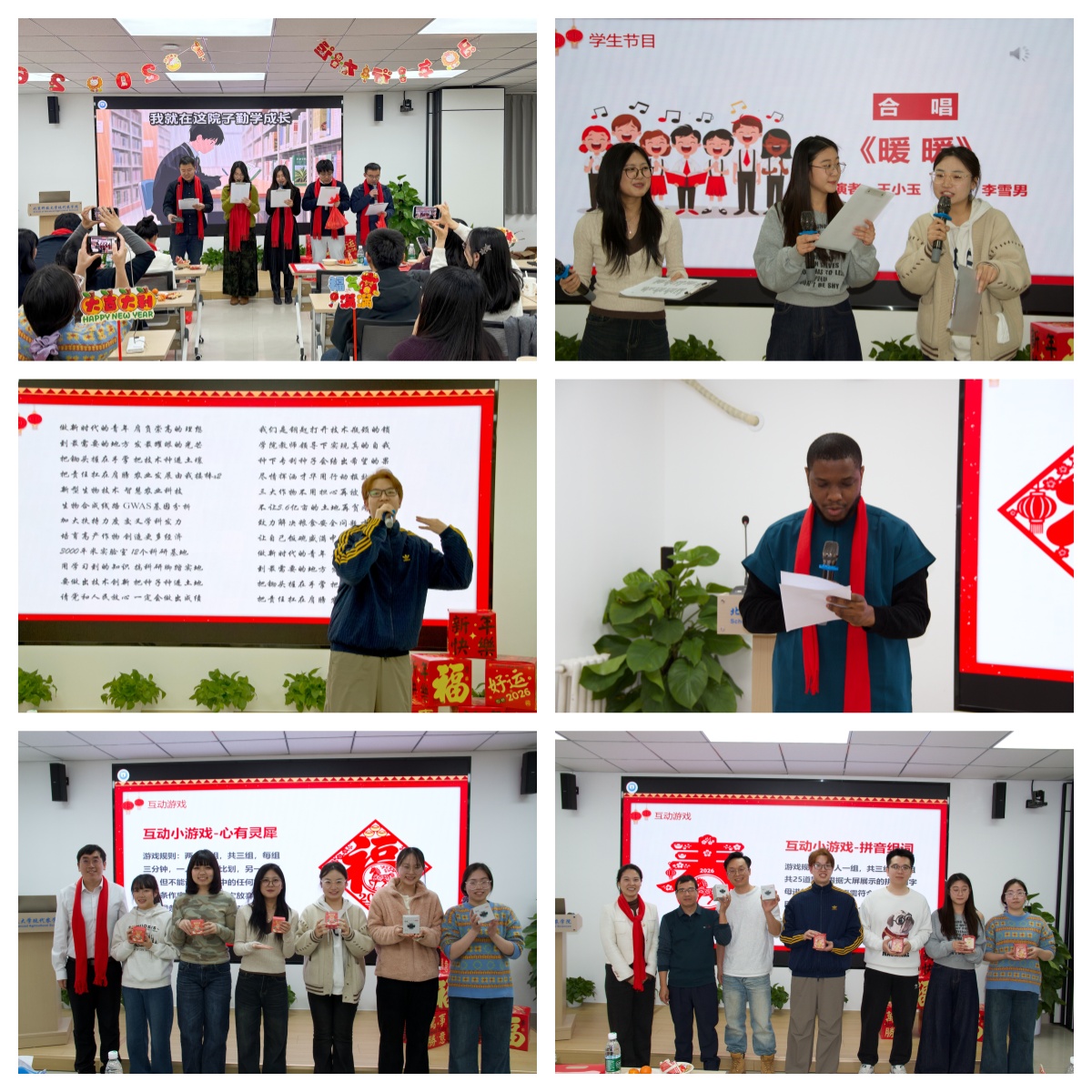 随后,师生联欢会精彩上演。青年教师代表合唱的《农学院是我的家乡》以温情的旋律唱出师生对学院的归属感和满满情怀。学生代表演唱的Rap串烧《我爱农学院》《初春》用新潮的节奏和鲜活的歌词展现青春活力;合唱《暖暖》以柔和的曲调传递师生间的温暖情谊;留学生的新春祝福用多元的文化表达为活动增添了国际色彩。